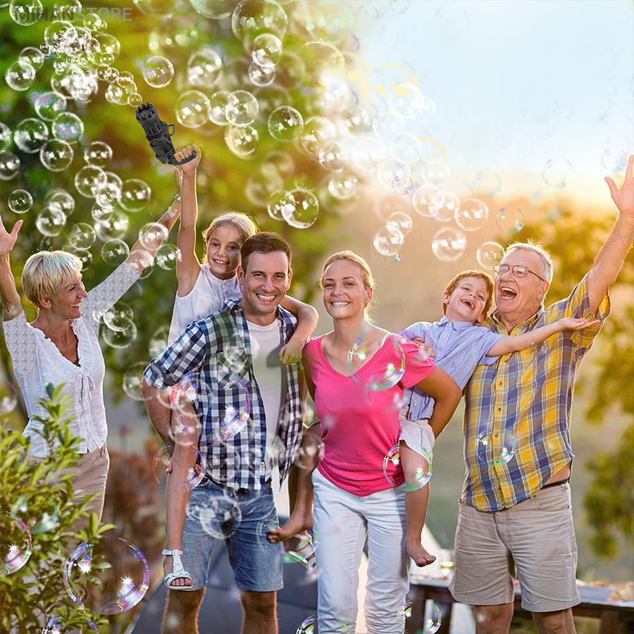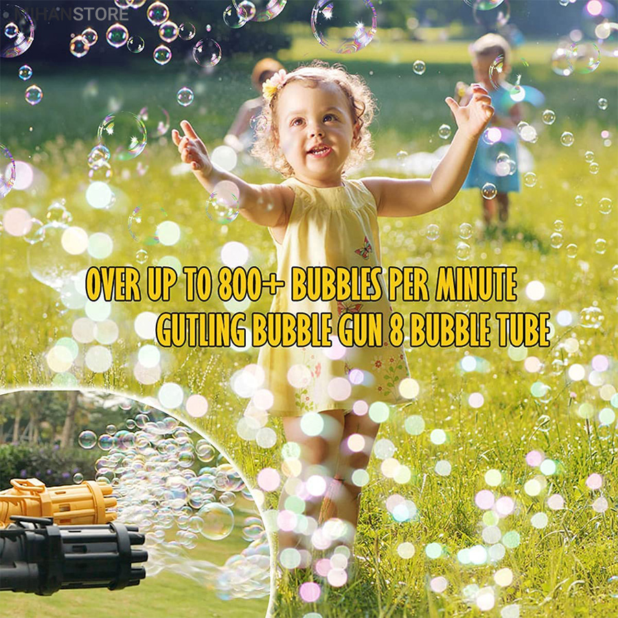 تفنگ الکتریکی حباب ساز BUBBLE GUN دارای 8 سوراخ است که می تواند صد ها حباب را در دقیقه در هوا پراکنده کند. تفنگ حباب ساز باتری خور بوده و با سه عدد باتری قلمی کار می‌کند. جنس بدنه این محصول از پلاستیک غیر سمی ساخته شده و از مقاومت خوبی برخوردار است. طراحی ابتکاری و جدید این مسلسل حباب ساز نیاز کودکان به تفریح را برآورده می کند و توجه آنها را به خود جلب می نماید. این دستگاه حباب ساز بهترین گزینه برای وقت گذراندن والدین با فرزندانشان می باشد و روابط عاطفی بین آنها را تقویت می کند. دستگاه حباب ساز موجود برای فعالیت های داخل و خارج از منزل مناسب است. طراحی جالب و منحصر به فرد اسلحه Gatling باعث توسعه ی تخیل و خلاقیت کودکان می شود و می تواند به عنوان هدیه برای کودکان سه سال به بالا استفاده شود. به علت ساختار محکم این محصول مایع به هیچ عنوان نشت نمی کند. سرعت پخش حباب نیز بسیار روان است و گیر نمی کند. برای کودکان بسیار راحت است که آن را با یک دست نگه دارند. رنگ حباب روشن است و بی بو است و البته بعد اتمام مایع این محصول خودتان هم می توانید به آسانی مایع حباب را با استفاده از آب و صابون مایع تولید کنید.