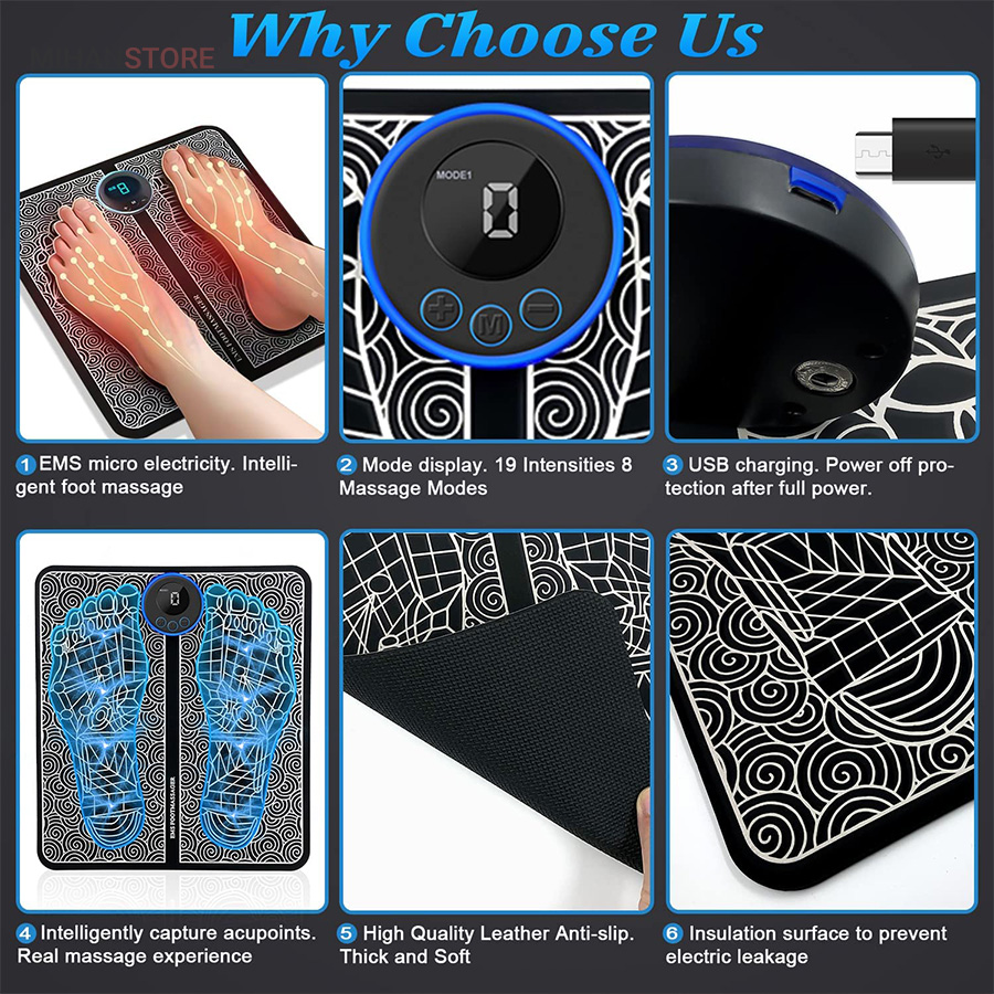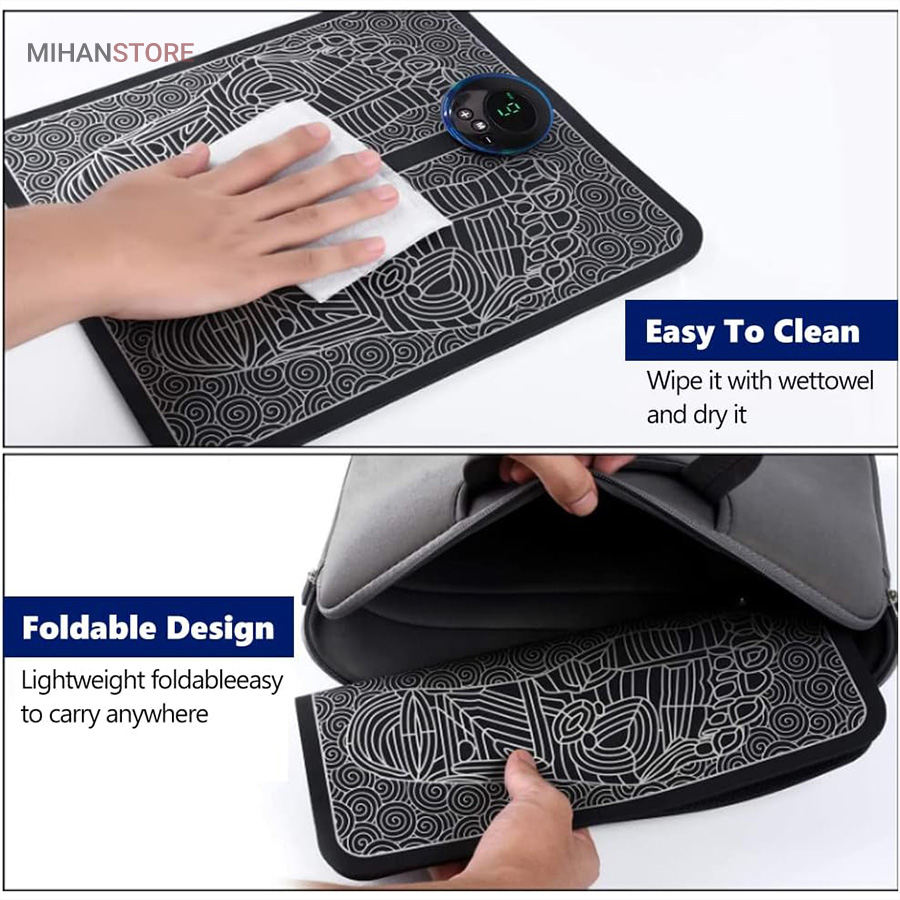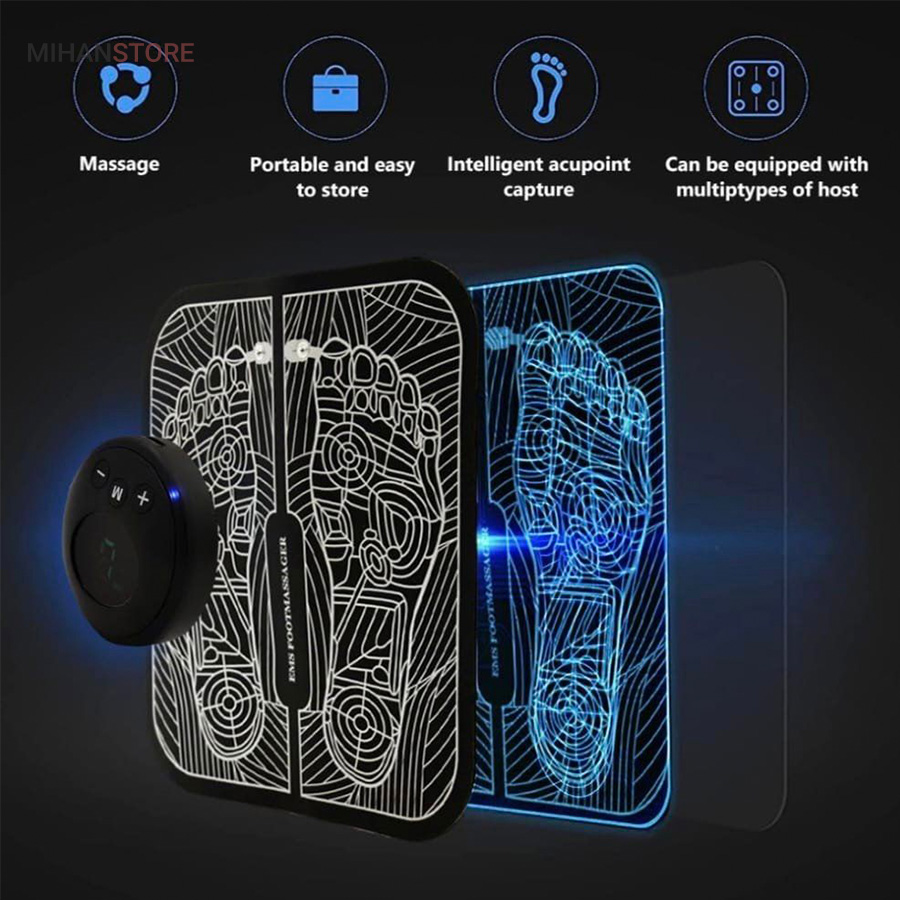 ماساژور هوشمند پا EMS Foot Massager یک پد نرم به نرمی پد یوگاست ولی بسیار باریکتر که توسط باتری موجود در کنترل آن امواج مغناطیسی را به کف پای شما میفرستد. کف پا را به تخصصی ترین شکل ممکن ماساژ میدهد. این ماساژور تاشو بسیار سبک و قابل حمل می باشد. باتری آن با کابل USB که بهمراه پد تقدیم شما میشود شارژ میشود. این پد که از جنس پد یوگاست به راحتی با دستمالی نم دار و به راحتی قابل تمیز شدن است. با کمک این پد بی صدا به آرامشی بی نظیر در کف پای خود خواهید رسید. چرا که این پد از کف پا با به گردش در آوردن خون در رگها و به حرکت در آوردن عصب ها پای شما را تا قسمت ران ها ماساژ خواهد داد. ماهیچه های خواب رفته و ضعیف را قوت میبخشد.برای برآوردن نیازهای مختلف ماساژ، تکنیک‌های شبیه‌سازی هوشمند ماساژ مصنوعی با توجه به ترجیحات شخصی و استرس فیزیکی، می‌توانند آزادانه از درجات شدت مختلف و حالت های مختلف به دلخواه انتخاب و تنظیم کنید.برعکس برخی ماساژور سنتی پا که وزن سنگینی دارند، این محصول فقط یک پد نرم و راحت برای پا است. سبک و تاشو با امکان حمل آسان در هر مکانی است. این ماساژور پا از مواد نرم مناسب یوگا و سطح چرمی ساخته شده است و با استفاده از حوله مرطوب قابل خشک شدن است. کاملا بی صدا است می توانید هنگام تماشای تلویزیون، مطالعه، کار در دفتر یا استراحت از آن استفاده کنید.با تکنولوژی EMS،گردش خون را در پاها و ساق پا بهبود می بخشد.بر خلاف ماساژورهای معمولی پا، ماساژور پا EMS بسیار ملایم است و برای انواع پوست مناسب است.این دستگاه برای افرادی که به باشگاه می روند، افرادی که مسافت های طولانی را طی می کنند، افرادی که اغلب دوچرخه سواری می کنند، می رقصند، از کوه ها بالا می روند و افرادی که دوست دارند کفش پاشنه بلند بپوشند، مناسب می باشد. همچنین برای مسافران، افراد میانسال و سالخورده، افرادی که دارای شغل اداری هستند مناسب است. ماساژ منظم پا به شما کمک می کند تا با خستگی های روزانه خود مقابله کنید. این دستگاه پاهای شما را در یک روز پر کار آرام کرده و خستگی انباشته را از بین می برد. ماساژور الکتریکی پا با ورود پالس ها به زیر غشاء پوستی خطوط عصبی را تحریک می کنند تا به طور خودکار با هم تعامل کنند و آرامش را به پا های شما بازگرداند.