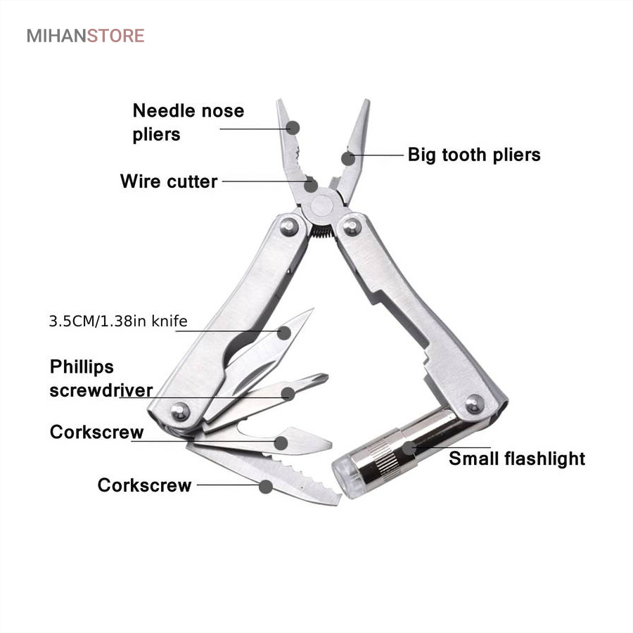 زمانی که قصد سفر ، شکار ، کوهنوردی یا کمپینگ و …… را دارید یک وسیله ی کاربردی که هم انبردست باشد و هم چراغ قوه و در عین حال توانایی انجام چندین کار مختلف را داشته باشد بسیار به کارتان خواهد آمد. انبردست تاشو چراغدار جیبی یک وسیله ی کاربردی چندین کاره میباشد که تنها ۷۰ میلی متر طول و ۱۳ میلی متر عرض دارد و بسیار بسیار کم حجم و سبک میباشدانبردست جیبی چراغدار چندین کاره دارای ابزارهای چراغ قوه ، چاقو ، اره ، پیچ گوشتی چهارسو ، پیچ گوشتی دوسو و دربازکن میباشدجنس این انبردست تماما از الیاژ فلزی ضد زنگ میباشد و بسیار مقاوم و بادوام ساخته شده استاین انبر دارای ۱ چراغ LED نور سفید میباشد که با ۳ عدد باتری ساعتی کار کرده و به روش پیچی روش و خاموش میشودانبردست جیبی چراغدار چندین کاره مناسب برای شکار ، ماهیگیری ، سفر ، کوهنوردی و کمپینگ ، همچنین از این محصول میتوان به عنوان یک ابزار کاربردی مهم و مفید برای داخل خودرو نیز استفاده کرد.