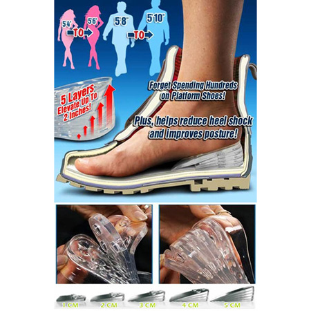 با ژل ها و پدهای افزایش دهنده قد با راحت ترین روش ممکن قد بلند شده و از آن لذت ببرید! این ژل ها در کف کفش قرار میگیرند و بطور نامرئی قد شما را در محیط بیرون بلند تر نشان میدهند. شما می توانید این ژل ها را از 1 الی 5 سانتی متر تنظیم کنید و به راحتی در کف کفش خود قرار دهید. این محصول از جنس ژل سیلیکا تهیه شده است و فوق العاده مقاوم، راحت و شیک می باشد و همچنین با تمام کفش ها و سایزهای موجود در بازار سازگاری دارد.