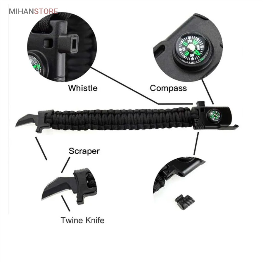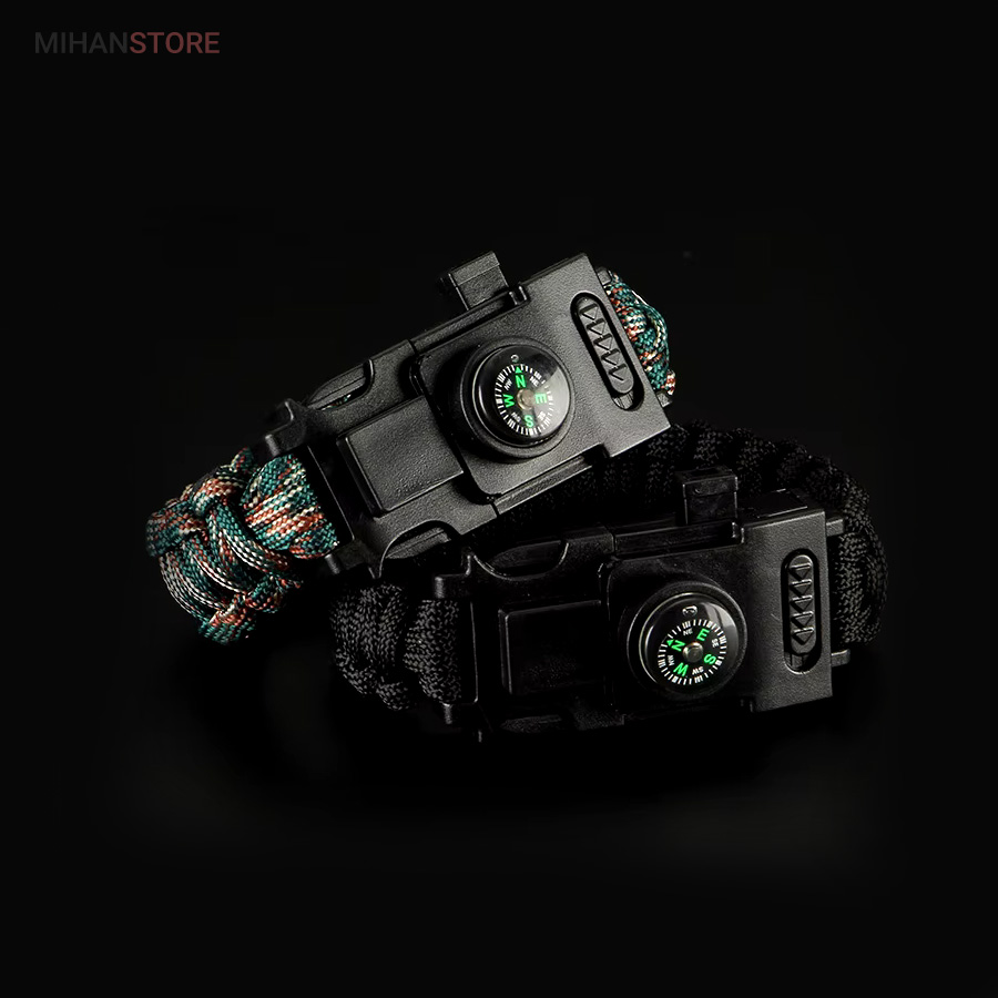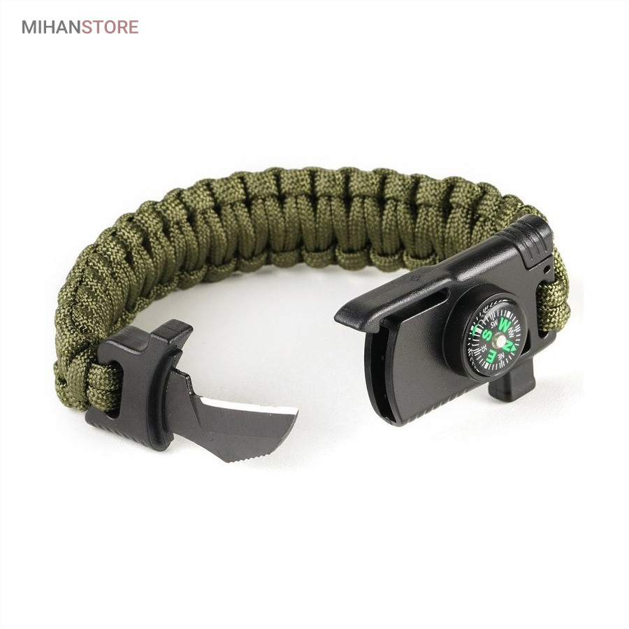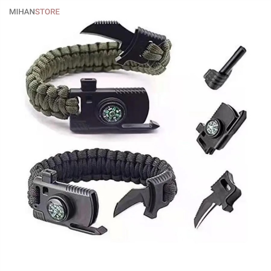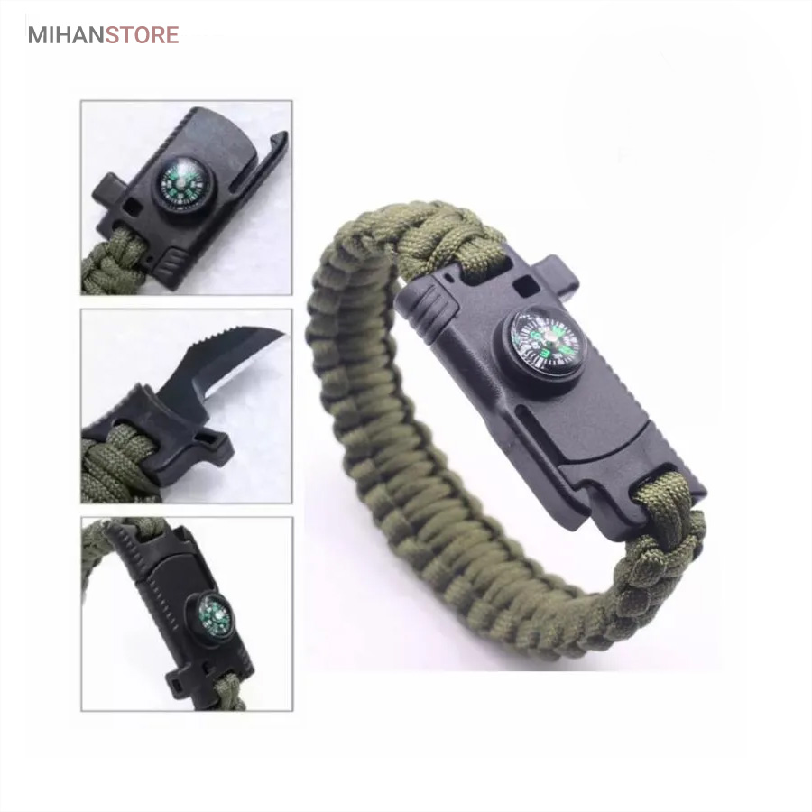 دستبند پاراکورد و نجات دارای وسایل ضروری برای بقا در طبیعت است، به وسیلۀ این دستبند می‌‌توانید به راحتی آتش روشن کنید، از ارتفاع پایین بیایید، مسیریابی کنید، ماهیگیری انجام دهید و… اگر به شکل دستبند پاراکورد و نجات نگاه کرده باشید متوجه می‌‌شوید که مانند یک طناب است، جالب است بدانید که طناب پاراکورد ساخته شده برای چتربازی هم مورد استفاده قرار می‌‌گیرد و از مقاومت و استحکام بسیار بالایی برخوردار است. مقاومت بالای این طناب به میزانی است که می‌‌توانید یک وزنه‌‌ی 200 کیلوگرمی را بدون نگرانی به آن متصل کنید، از طناب پاراکورد علاوه بر چتربازی می‌‌توان در ماهیگیری، بند آوردن خونریزی، درست کردن آتش،  فرود آمدن از ارتفاع، طناب نگهدارنده‌‌‌‌ی چادر، درست کردن پناهگاه و… نیز استفاده کرد.دستبند پاراکورد و نجات معمولا از 7 تا 9 رشته طناب با طولی 3 تا 4 متری تشکیل شده است که می‌‌توان برای مصارف مختلف در سفر از آن استفاده کرد. دارای ضروریات مربوط به یک سفر بوده و همچنین می‌‌تواند به دلیل زیبایی آن نیز مورد استفاده قرار گیرد، این وسیلۀ کاربردی می‌‌تواند کادوی بسیار مناسبی برای افرادی باشد که بسیار در طبیعت سفر می‌‌کنند. قطب نما، سوت اضطراری این سوت سطح سر و صدا را می‌تواند تا 110 db ایجاد کند و به امدادگران سیگنال دهد و چاقو که برای برش طناب و مواقع ضروری مورد استفاده قرار می‌گیرد و پشت چاقو در قسمت بالا هم دندانه‌هایی قرار دارد.