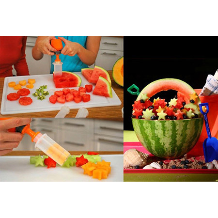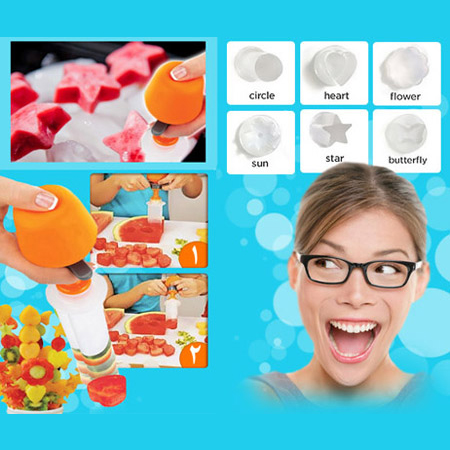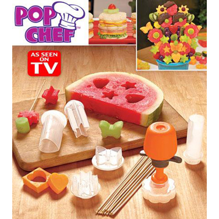 به وسیله قالب میوه پاپ چف شما می توانید میوه ها و خوراکی ها را به اشکال مختلف در آورده و از خوردن آنها لذت بیشتری ببرید. پاپ چف یک وسیله ساده و کارآمد است که شما را قادر میسازد در کمتر از چند ثانیه و در 3 حرکت میوه ها و خوراکی ها را به شکلهای مختلف و با ضخامت های مختلف درآوید. فقط کافیست قالب را بر روی میوه بفشارید و مخزن هوا را به قالب وصل کرده و فشار دهید تا خوراکی هایی با اشکال زیبا و خوشمزه داشته باشید و از خوردن آنها لذت ببرید. از پاپ چف می توانید برای تزئین‬‎ میوه، کیک و شیرینی های مختلف استفاده کنید.